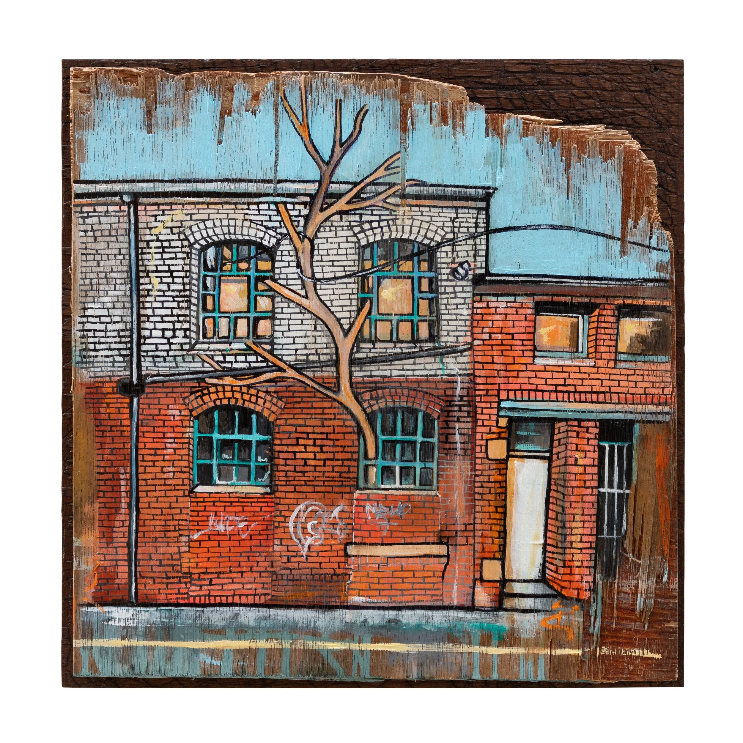 This painting on wood depicts a small building with boarded-up windows. A tree growing up through the building’s facade. Does the tree support the building, or is it slowly helping in it’s demise? The two become co-dependant for today.